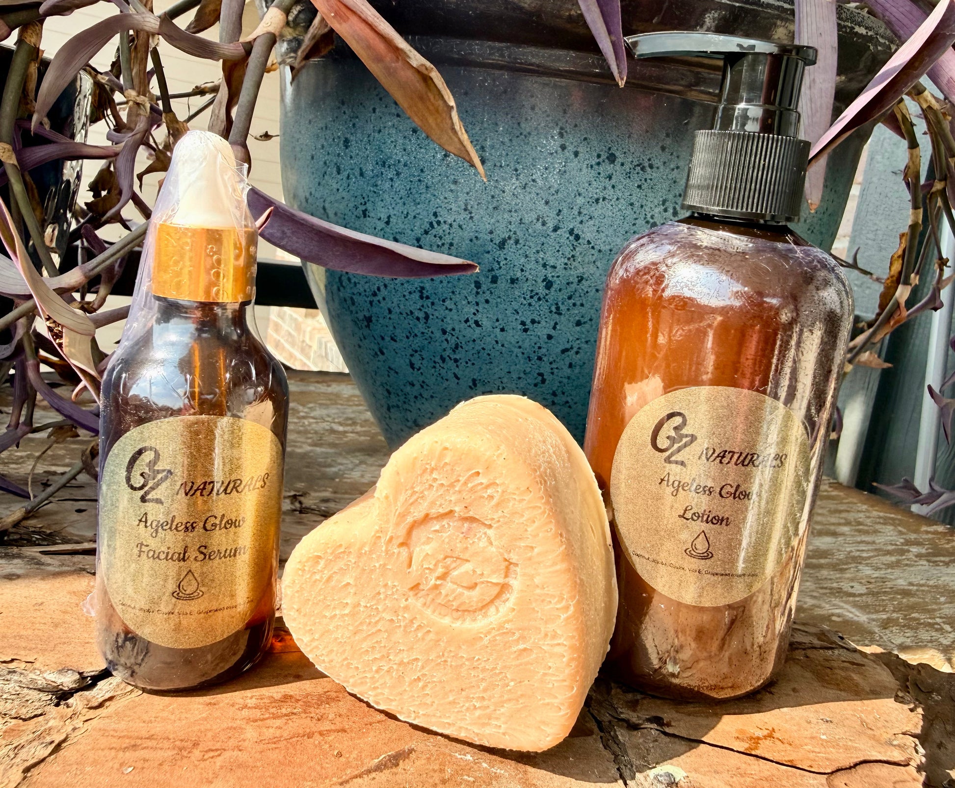 This curated collection features our beloved Ageless Glow Facial Serum alongside complementary Ageless Glow Lotion and handcrafted soap, all infused with the same therapeutic blend of geranium, frankincense, patchouli, and cedarwood essential oils.