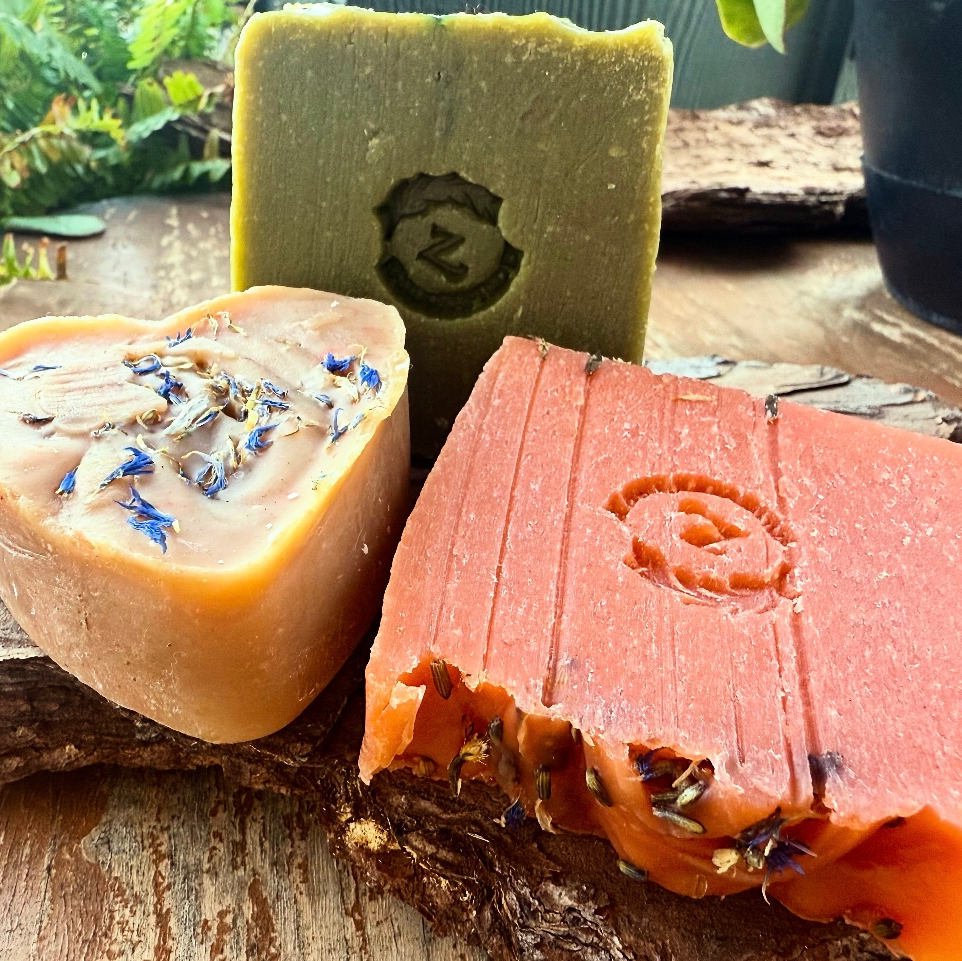Zein's soaps have no harsh chemicals outside of the lye used to make the soap, which chemically changes once the curing process is done. They are then no longer toxic to the body. She uses natural ingredients and colorants, like clays, spirulina, rose powder etc to color her soaps, so that hormones are never disrupted! Zein's top passion is for the body to always be detoxifying through the skin.