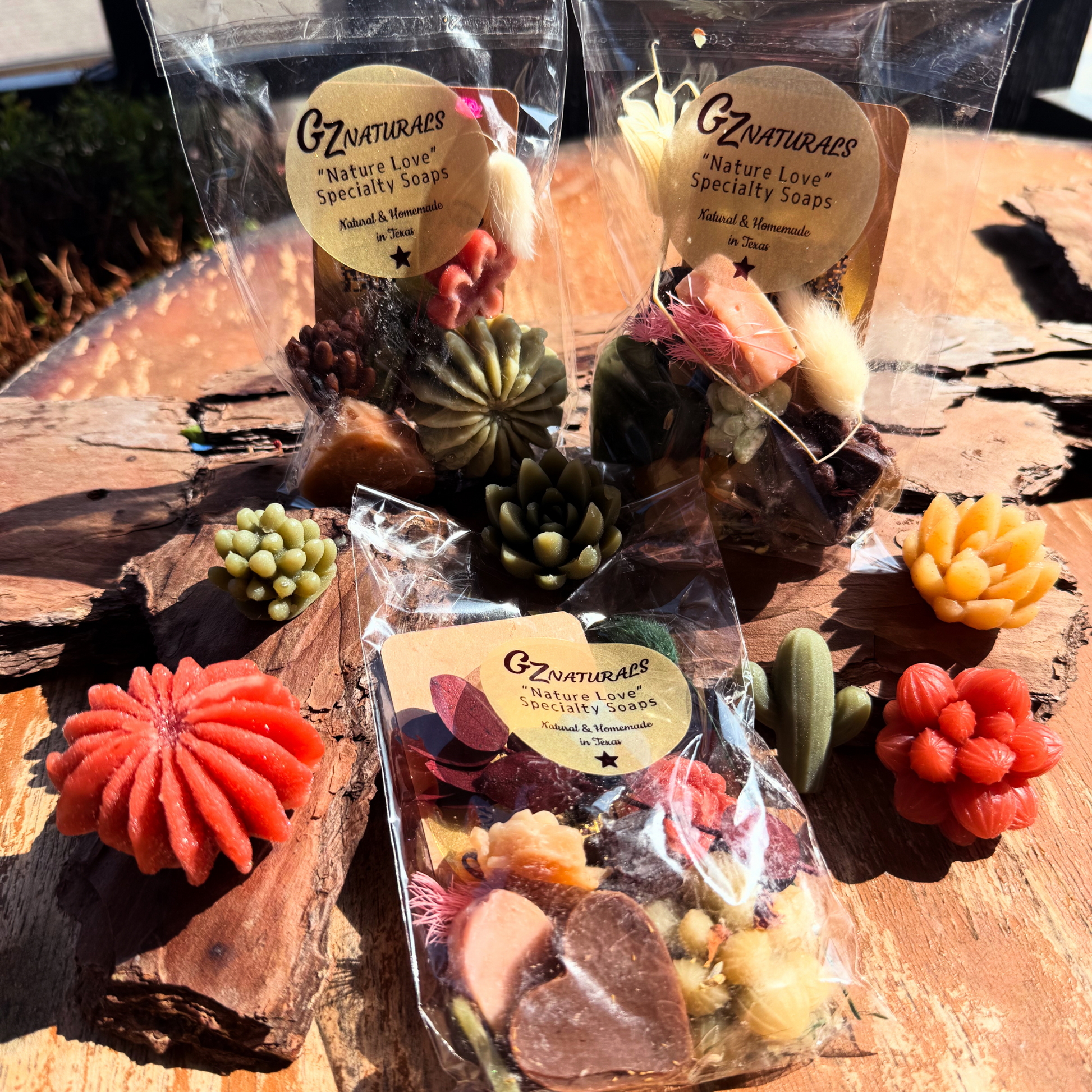 These fun shaped soaps are great for use or for decoration. Wonderful gifts for any occasion! They are shaped in shapes like hearts, cactus, succulents, Texas, Leaves and more. These soaps are colored by nature through herbs, spices, clays and roots. Enjoy these precious soaps!